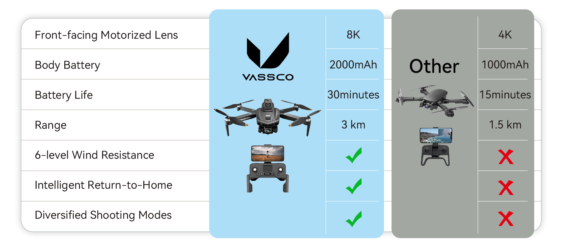 The Vassco drone features an advanced Intelligent Follow system. Simply tap your target on the App to lock the subject. Whether running, cycling, or skating, the drone automatically plans its flight path, keeping you or your chosen subject centered in the frame at the ideal angle. This makes complex tracking shots effortless, ensuring your spectacular moments are always in focus.