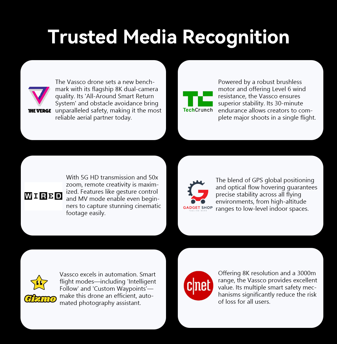 The Vassco drone features a 4-Direction (Front, Back, Left, Right) Sensing and Perception System, which instantly builds a 3D model of the environment—a flagship industry configuration. It quickly identifies obstacles and automatically plots a safe detour. This technology significantly enhances flight safety and drastically reduces the risk of crashes. Whether you're a novice or flying in complex terrain, you can eliminate flight anxiety, protect your valuable equipment, and focus more on capturing spectacular footage.