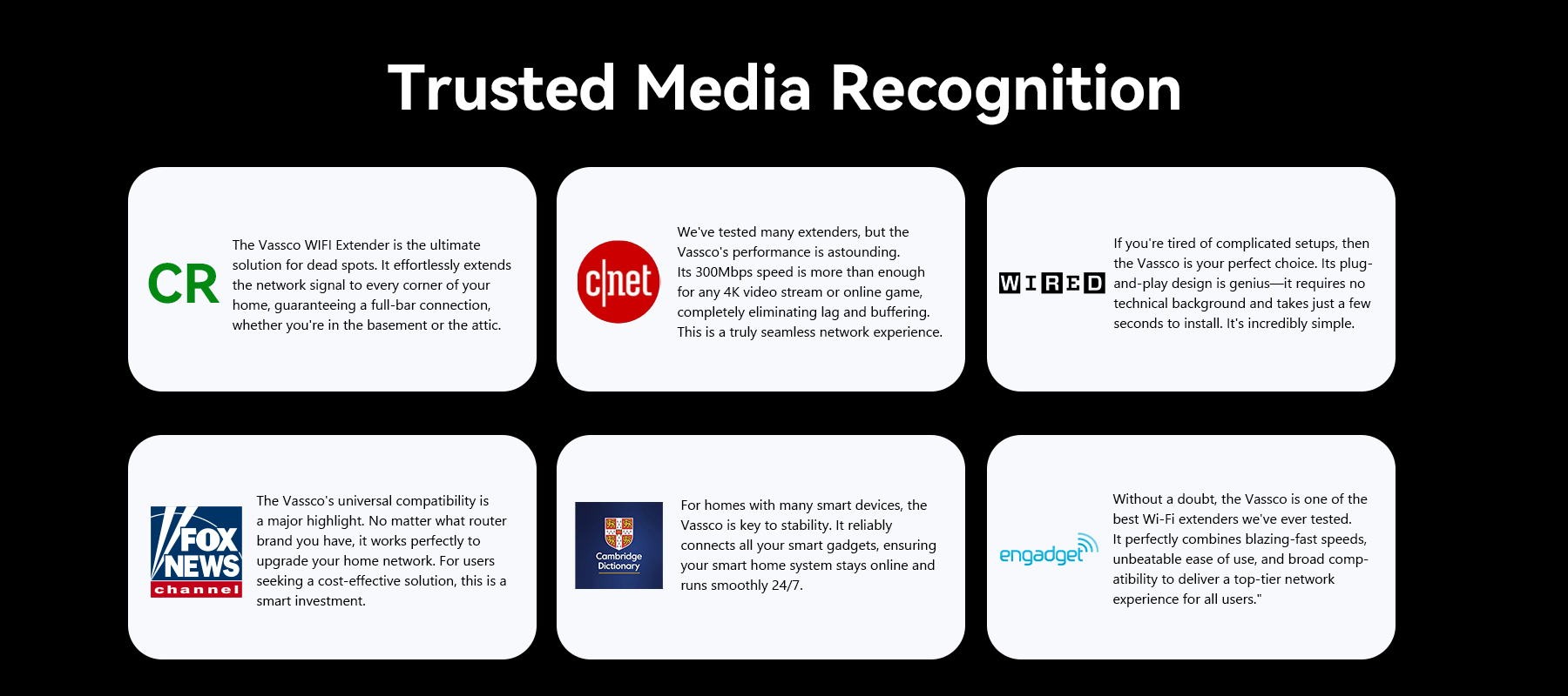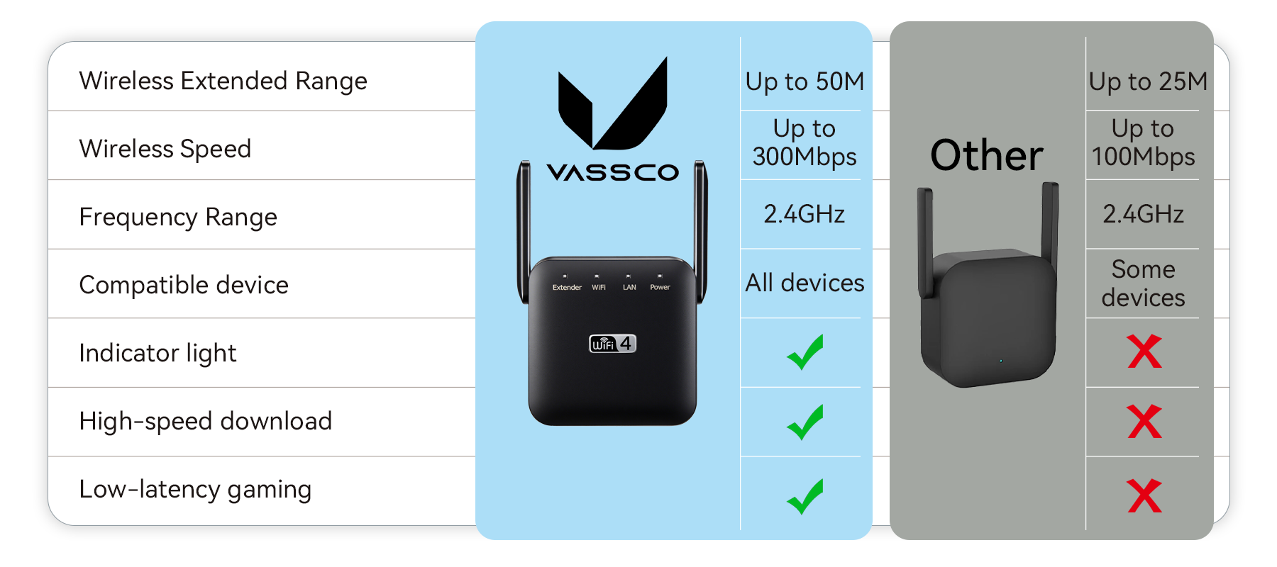 Tired of your family fighting over bandwidth? When one person is watching a 4K movie in the living room, others playing games or video calling experience lag, which often leads to frustration and arguments.The Vassco extender puts an end to all those network worries by providing Smooth Wi-Fi for the Whole Family. It ensures every device gets a stable, high-speed connection, so your smart TV, gaming console, or phone can all run smoothly at the same time. Say goodbye to buffering and lag, and bring true harmony to your home network.
